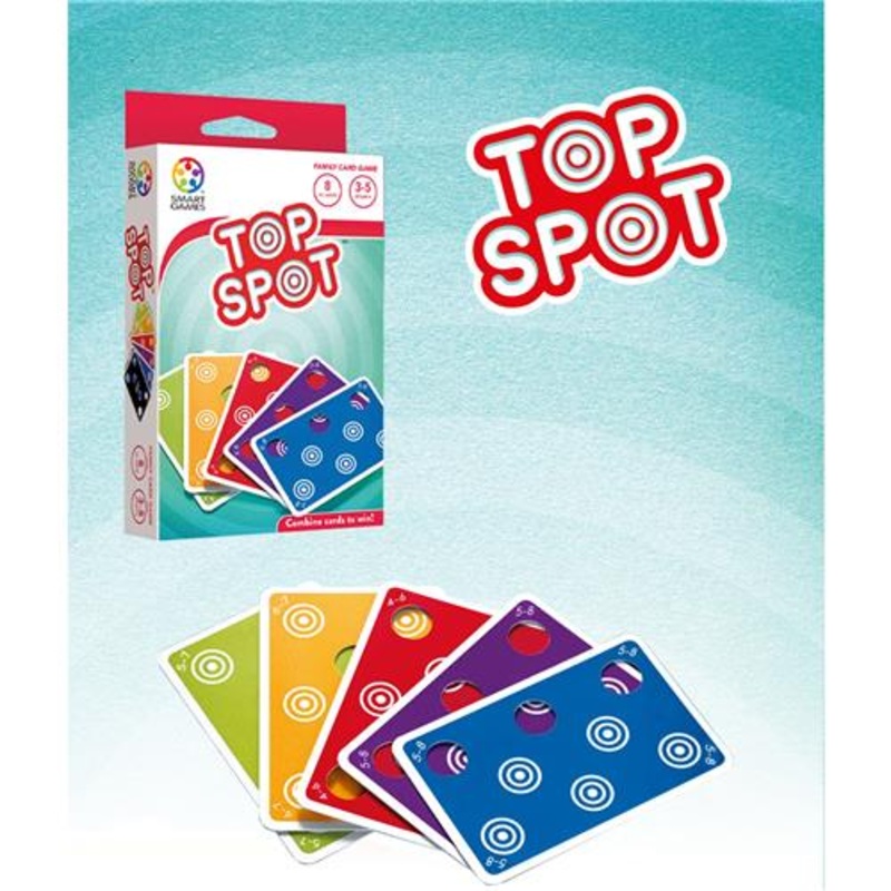 Top Spot is a multi-player game with cards that have spots and holes. By strategically combining cards, players win rounds and score points. The object of Top Spot is to achieve the highest points total over the course of a Match.