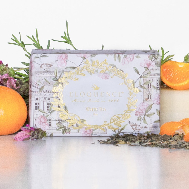 Each Eloquence Perfume Bar Soap is crafted with intention in the traditional French style with a triple-milled olive oil base to create a smooth and long-lasting soap, free from impurities. These classic, cream-colored bars are formed from natural and organic ingredients that work into a luscious, high-quality lather that leaves your skin clean, soothed, and moisturized.