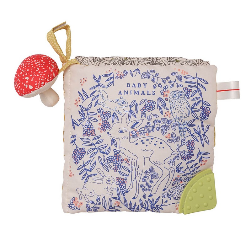 Soft textured fabrics for tummy-time play. The animal-themed soft activity book folds out flat doubling its as a pat-mat for tummy time. Each page features nostalgic illustrations, various fabric textures, and playful surprises.