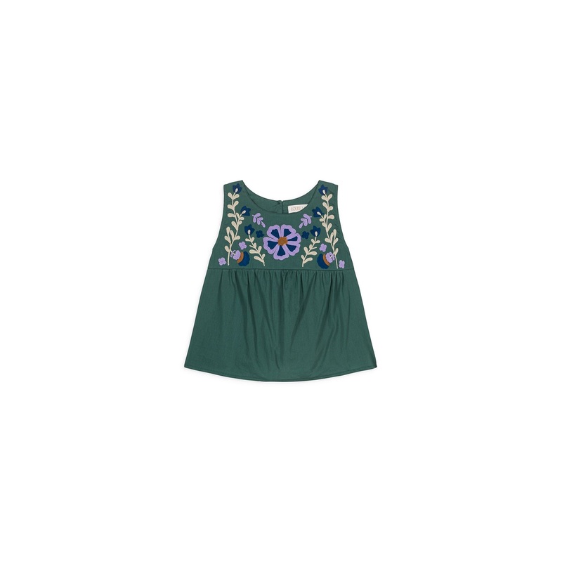 The details we love:Cotton voile top.Embroidered breastplate.Tear drop opening with button at the back.Rounded crossover panels in the back revealing the lower back.Please note: for sizes under 3 years, no crossover sections at the back, buttons from top t