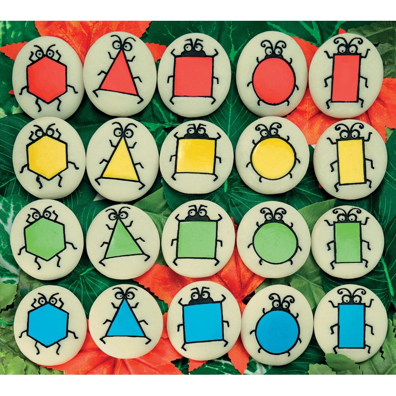 Explore color, shape and pattern! Each durable stone measures 1.5 and has a colorful bug character engraved on one side. Each set includes 20 stones, with five bug body shapes circle, square, rectangle, triangle and hexagon in four colors red, blue, yellow and green. Great for indoor and outdoor play. A leaflet with additional activities is provided with ideas on how to introduce the stones to your setting, plus games exploring sorting, counting and pattern skills.