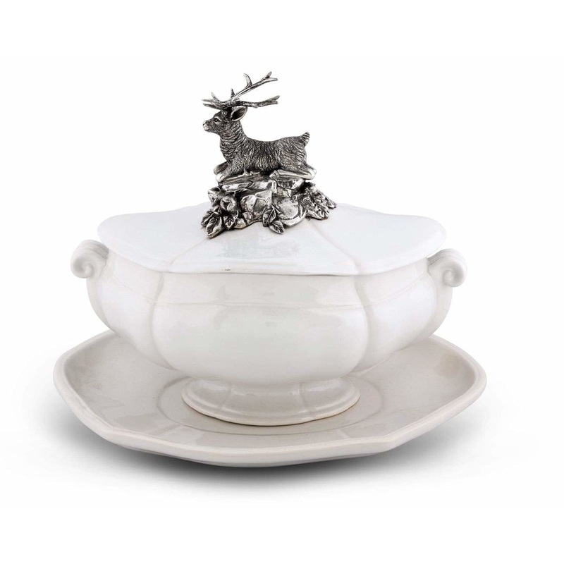 A miniature artwork of luxury pewter forms the finial handle on our lidded soup tureen. A proud stag rests on a rocky mountain outcropping surrounded by a scattering of acorns and oak leaves, extravagantly detailed and lovely to behold.