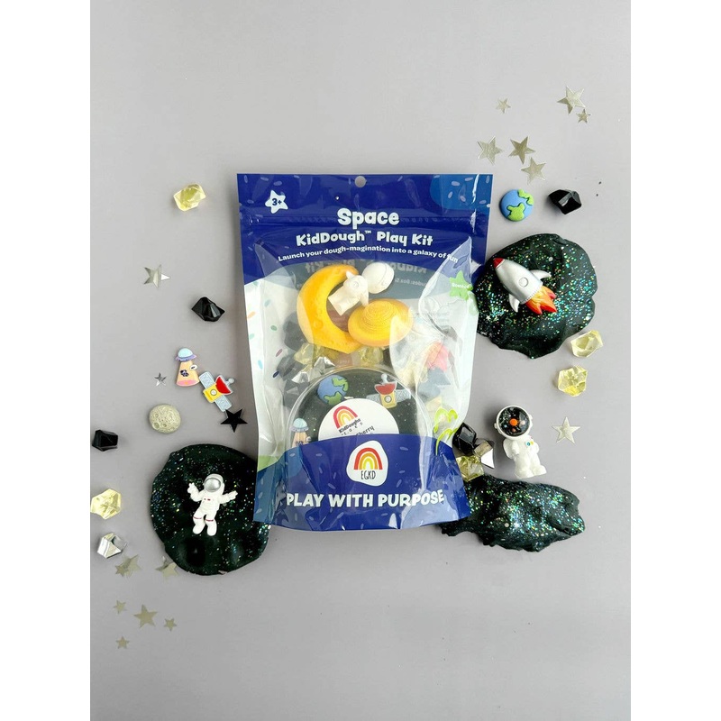 3-2-1….. BLASTOFF! Launch your dough-magination into a galaxy of fun with the Space KidDough Play Kit!Includes: 8 oz Black (Black Cherry) KidDough with Space Glitter and Space Charms (Earth, Moon, Satellite, Astronaut, UFO), Astronaut Figurine, Planet Figurine, Crescent Moon Figurine, Rocket Figurine, Yellow, Silver and Black Acrylic Space RocksOur super silky sensory doughs are buildable like a modeling compound however they are softer, more pliable, and far longer lasting than any you have tried before! Every all-natural KidDough is made with non-toxic food grade ingredients and is totally taste safe. KidDough is the best way to play dough!Handmade in the USAThis Play Kit is recommended for Ages 3+Ingredients: Wheat Flour, Salt, Canola Oil, Cream of Tartar, Water, Food Coloring, Organic Potassium Sorbate, and Natural Fragrance