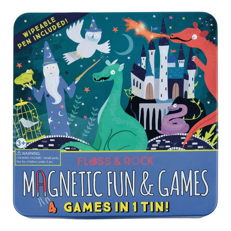 1 tin . 4 games.a great gift and perfect for taking out and about. All of the scenes and pieces are magnetic so easy to keep contained. There is Snakes & Ladders, Tic Tac Toe, Word search and a Magnetic Scene with pop out pieces. Themed around wizards, dragons and castles. The set also includes a bag to store all of the bits and pieces and a dry wipe pen for the word search. Great fun for playing alone or with friends and family.