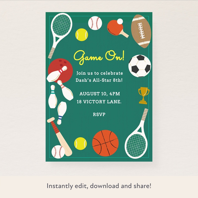 Game on! Get in the zone with these sporty invitations, perfect for active parties and game-day celebrations. Simply add the details of your celebration, including the name, date, time and party address, to personalize it and make it truly unique. Please n