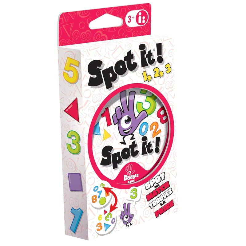 Spot It! 1,2,3 adds an educational twist on the family favorite Spot it! for kids as young 3 years old and up! The 30 cards feature 31 different symbols with 6 symbols on each card. 1,2,3 features symbols that are perfect for helping to teach and reinforce numbers and shapes. This version of Spot it! makes learning fun with quick, engaging gameplay and multiple game types. Exists in two formats.