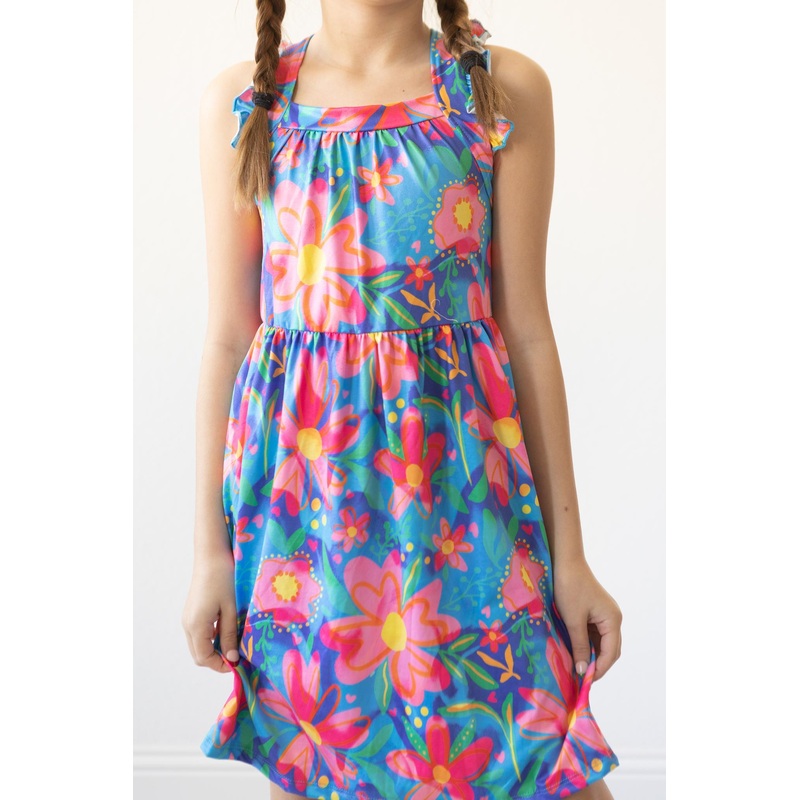 Perfect for summer! Straps criss cross in the back. Features a sweet ruffle on the shoulder. Available in a matching baby romper for family matching. Super soft fabric stays bright wash after wash. Instructions: Wear-Twirl-Repeat. True to size fit. Made of