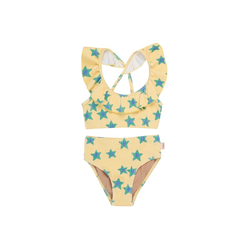 Dive into summer with the ever popular TINY swim collection! This Starflowers Swim Set in rib fabric is a fun two-piece with frill cross back straps and classic briefs. The contrast star pattern shines against the mellow yellow base. Your little one will adore this stylish and durable swimsuit for sunny days at the pool or fun days at the beach.