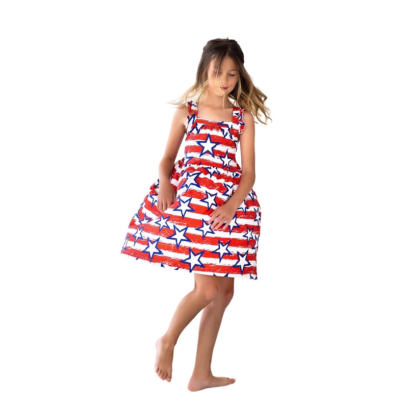 Perfect for summer! Straps criss cross in the back for added style. Finished off with a sweet ruffle on the shoulder. Also available in a matching baby romper. Great for family matching. Super soft fabric stays bright wash after wash. Fit is true to size.