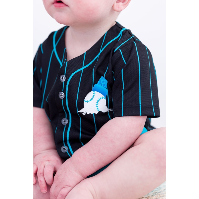 Features a sleek black and blue pinstripe design with vibrant accents. Showcases a playful baseball ice cream cone graphic on the front. Delivers major league vibes with bold, waffle cone-inspired numbering on the back. Made of 100% polyester for a lightwe
