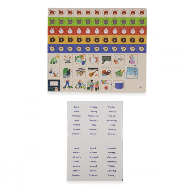 Set of 20 "Activities" magnets. 55 "Animals" magnets. 1 sheet of labels for days of the week in multiple languages. Languages included: French, English, German, Dutch, Italian, Spanish. Compatible with J05469 - Organization Chart.