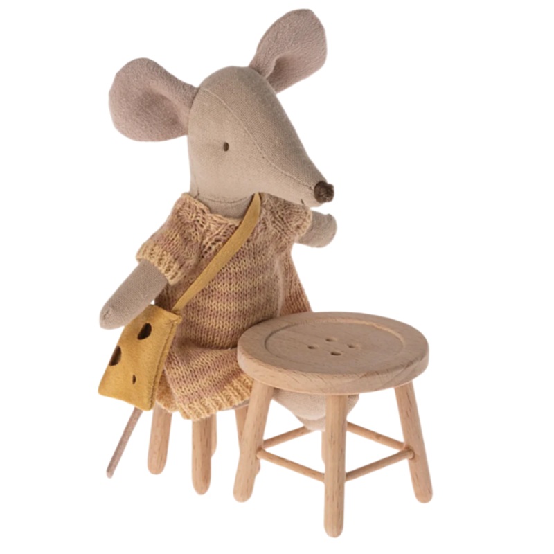 A stool and table set made for the mouse family. It is inspired by buttons and can be mixed with other mice furniture and accessories to create a lovely home. It fits perfectly into the Mouse Hole Farmhouse.