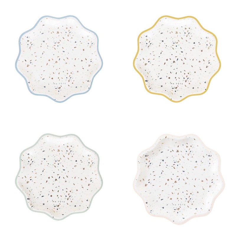 Pack of 8 Size: 7" Signature terrazzo pattern with gold foil details 4 designs: blue, mint, mustard, pink edges Die-cut with gold foil details, 2 of each design