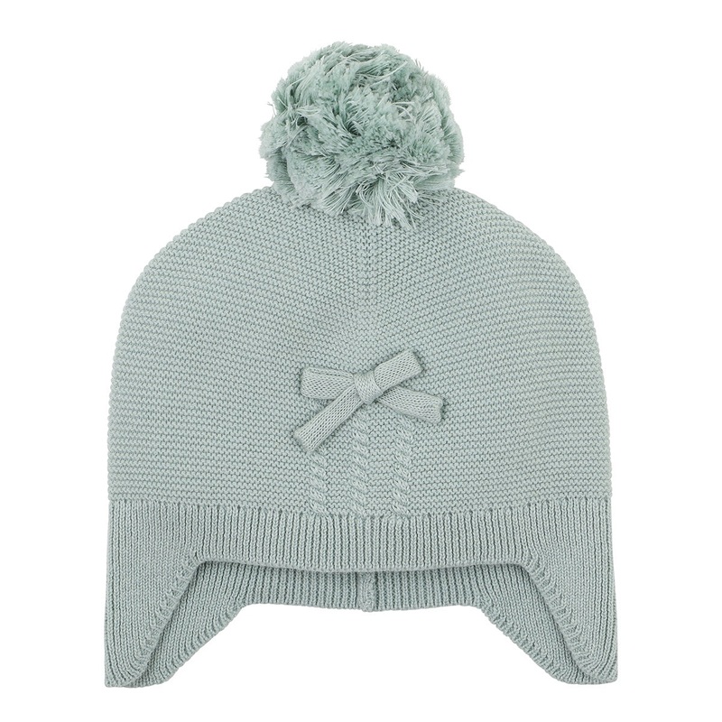 Style no: KXW21408This classic sage knitted beanie with ear flaps features a cable design, front bow and pom pom, making it the perfect staple for keeping cosy and warm in winter.