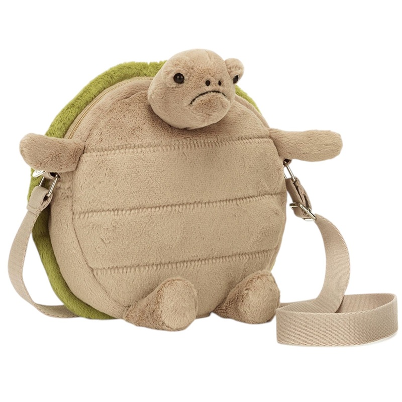 The Timmy Turtle Bag is charmingly grumpy, with a textured beige tum and embroidered green shell. The strong webbed strap will keep Timmy safe riding on a shoulder. With a silver zipper, Jellycat tag and protective beige satin lining, this bag holds everything but grudges!