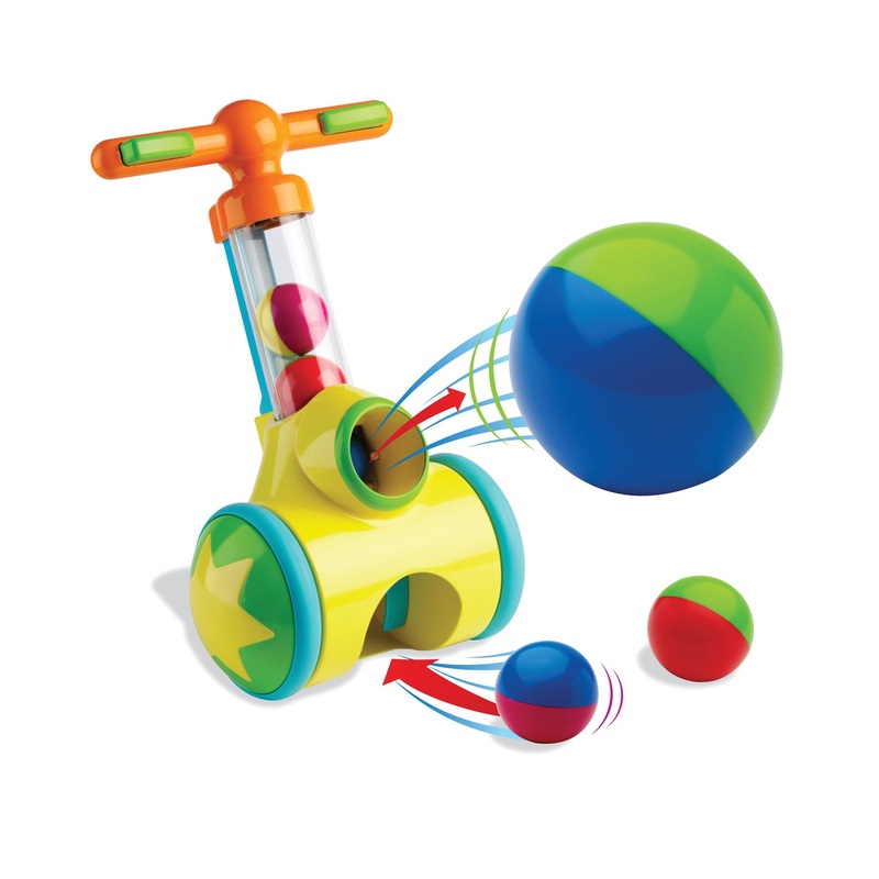 – Children can launch the balls out of the chute by pressing a button & then collect them again by wheeling the toy over the ball!