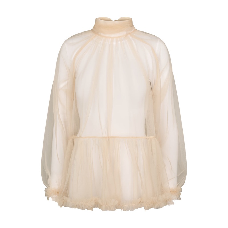 High-necked transparent tulle blouse with lots of volume for women. The blouse has beautiful tulle ruffles on the sleeves and waist and closes with buttons and ties at the back. Standard 100 by OEKO-TEX certified (OEKO-TEX STANDARD 100 license no. 14.HIN.4