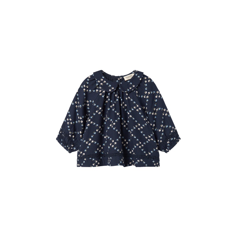 Loose-fitting, long-sleeved soft viscose blouse for the little ones with a floral print. The blouse has a small collar and lace edge details. The blouse closes at the back with buttons.