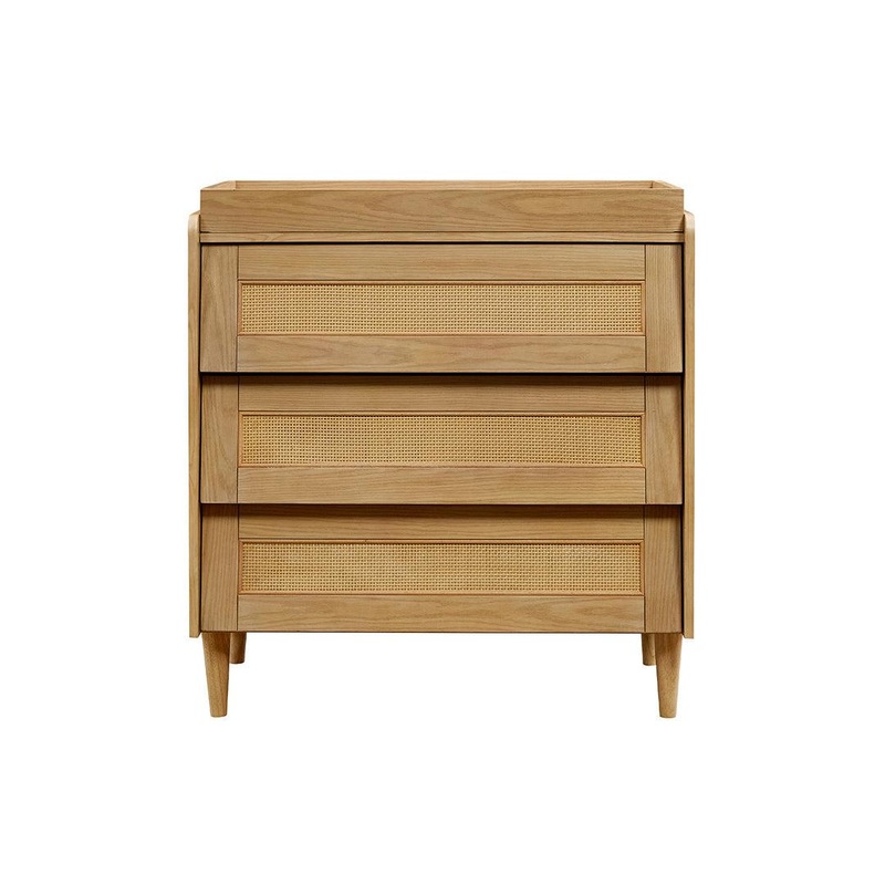 The Tutti Bambini Japandi Chest Changer in Light Oak is crafted with a harmonious blend of natural rattan and wood textures, the Japandi Chest Changer in Warm Walnut is both stylish and practical, offering 3 generously sized drawers with a slow-closing mec