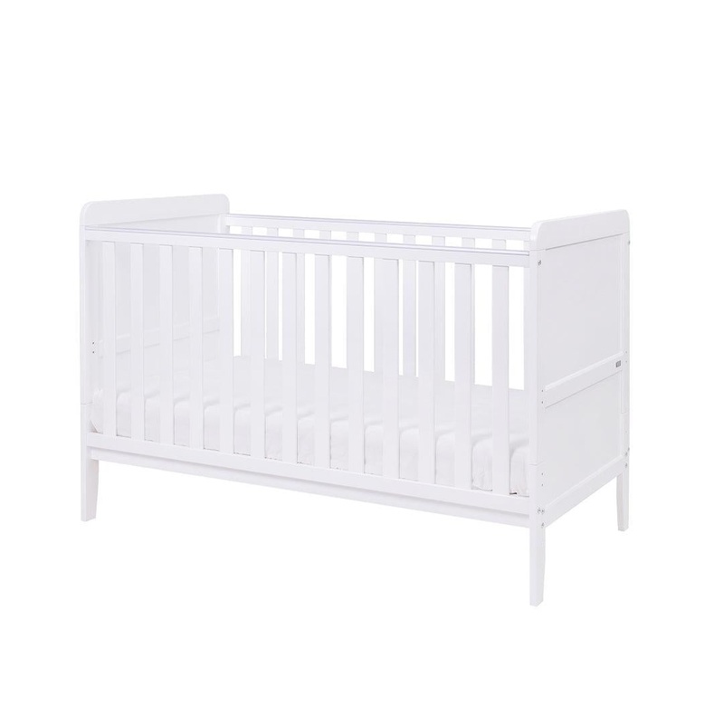 Crafted from solid New Zealand Pine with a timeless white finish, this cot bed brings a light, airy feel to your babys room. It offers multiple mattress positions, protective teething rails, and gently transitions into a toddler bed when your little one is ready, supporting sleep and growth up to around 6 years old.