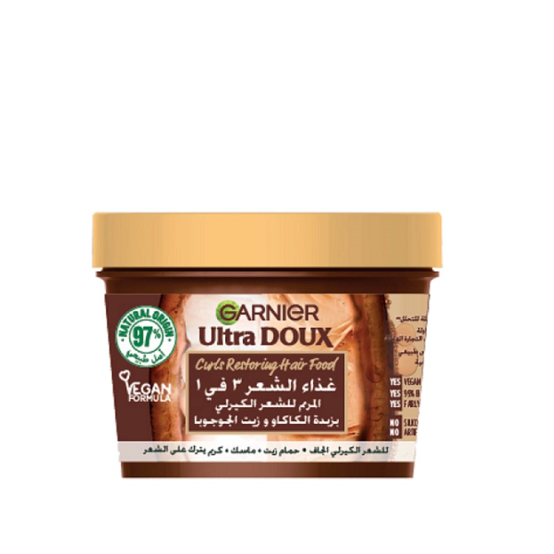SHORT DESCRIPTIONGarnier Ultra Doux Hair Food Cocoa Butter & Jojoba Oil is the new way to nourish hungry hair. With 98% Natural Origin and 100% Vegan Blends, it is enriched with Super Food Extracts for Super Hair.DESCRIPTIONThis Ultimate blend of Cocoa But