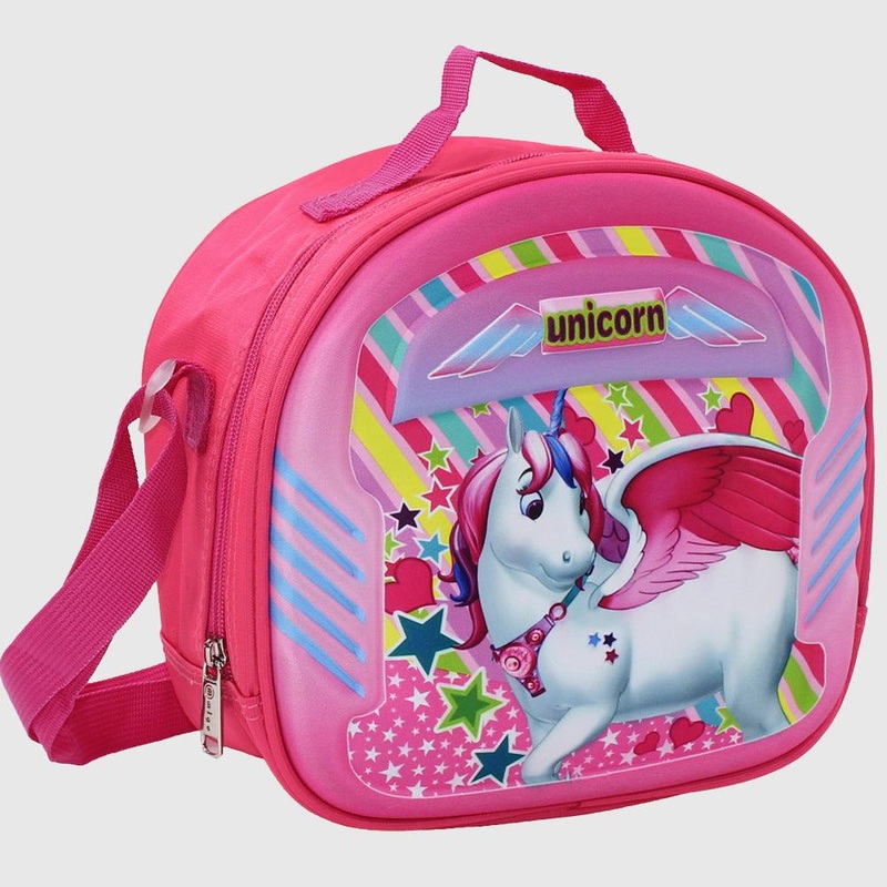 This lunch bag is perfect for school. Your little kid will love it! Features a screen print of a unicorn, a large compartment, a carry handle for easy transporting, and secure zip closure.