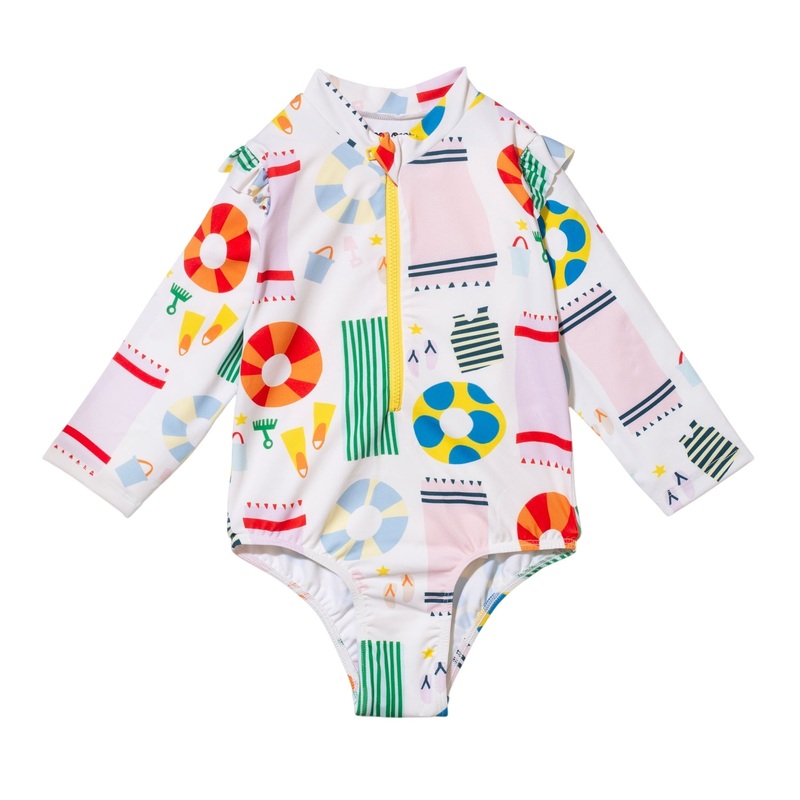 Responsibly made with recycled plastic bottles. UPF 50 and chlorine resistant for sun protection. Features snaps underneath for easy pull-up. Available in sweet cherry or beach print. Swim fits true to size; refer to the size guide. Made in Portugal.