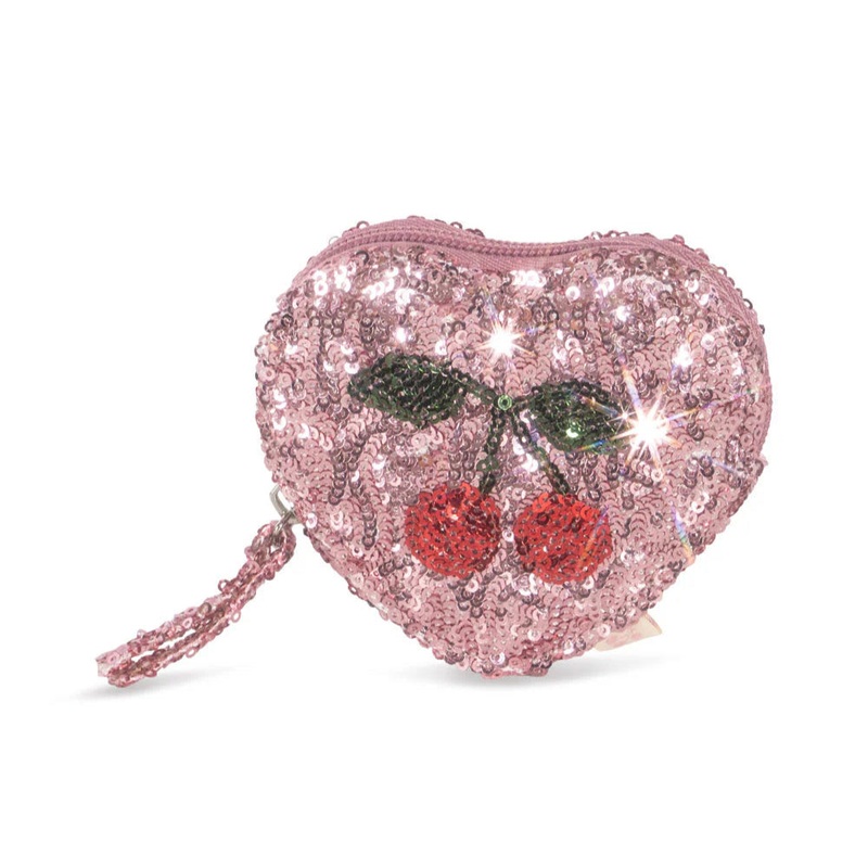 Heart-shaped sequin wallet designed with the Konges Sljd signature cherry on the front.