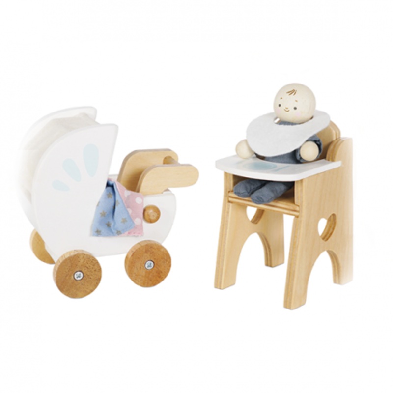 Hush a bye baby. This delightful nursery set makes a sweet addition to your child's pretend play universe.Comprisinga poseable wooden baby, a buggy, highchair and all accessories as pictured, it makes for the sweetest dreams for any new family addition.Exp