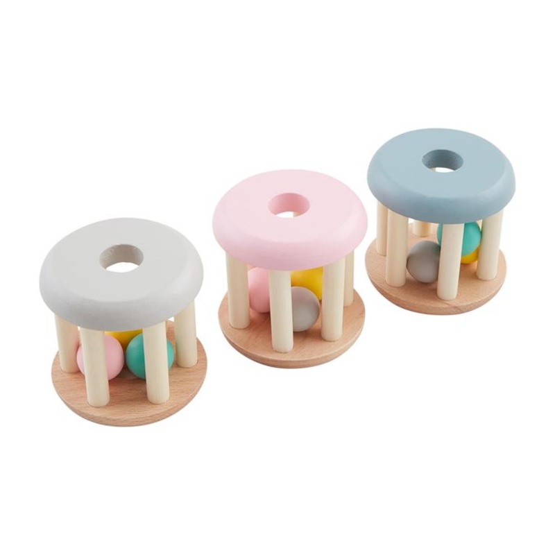 Classicwoodenrolling rattle with beads in the center.PLEASE NOTE:These are sold individually. Please let us know if you have a color preference. Options are gray, pink or blue.The little details:Each rattle measures2 1/2" x 2 1/2" diameter. Made of pine wo