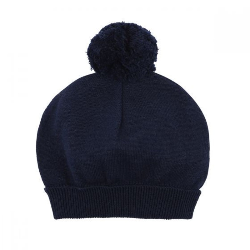 This practical navy knitted beanie features a rib knit fold back band, pom pom, and is perfect for keeping snug and warm in winter.