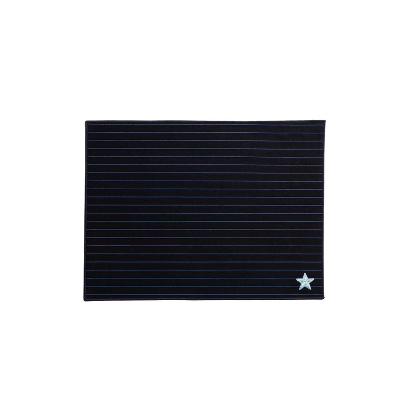Features a navy ruled stripe with tonal edging. Includes a charming light blue star design. Reversible with a pop of canary yellow canvas. Combines friendly appeal with versatile design. Perfect for adding character to your dining table.